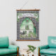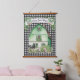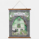 This farmhouse style Hanging Tapestry features an all over black and white gingham check pattern with a Green Barn behind a cow, pig and sheep. A banner above the barn says "Farm Sweet Farm."