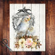 Cute, White Leghorn hen and her chick behind a light pink and yellow floral bouquet. Farmhouse country, vintage, victorian, lettering signage on a worn, white, wooden board background. Perfect for a rustic farmhouse or french country vibe, especially doing decoupage crafts.