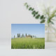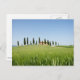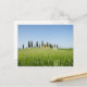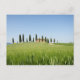 Postcard of a farmhouse with cypress trees and waving wheat grains in spring in the Val d’Orcia valley in Tuscany, Italy.