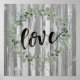 Farmhouse Inspiration I by Jennifer Paxton Parker. Features "Love" in script with a beautiful green wreath and distressed wood panels.