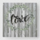 Farmhouse Inspiration I by Jennifer Paxton Parker. Features "Love" in script with a beautiful green wreath and distressed wood panels.