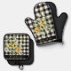 Rustic country trendy retro kitchen monogram and name personalised oven mitt and pot holder set with black and white gingham plaid pattern and yellow sunflowers botanical bouquets. +++++++++ It can be a modern kitchen gift for a family, relative, friend, bride on a bridal shower, wedding, birthday, Christmas or any other occasion.
