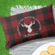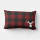 The product design features a silhouette of a deer on a classic red and black buffalo plaid pattern. Combined with your own personalised text, this composition makes a rustic, modern, and unique outdoor lumbar pillow.