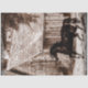 Rustic farmhouse or barn background with vintage newspaper overlay, and horse stamp.