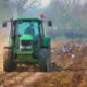 Preparing for the next crop. The tractor ploughs (ploughs) the field and wild birds look for food in the freshly turned soil. Watercolor England.
