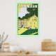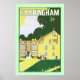 Vintage travel poster for transportation excursions to Farningham in Sevenoaks, Kent, England in an art deco style illustration with simplistic lines and color blocking.