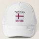 The Faroe Islander flag, a red and blue Nordic Cross on a white background, is shown here with the words or name FAROE ISLANDS, below, in show capped red letters with a blue border. Above is a space for your name to customise your look. Or, add someone else's name for a customised trucker hat gift.