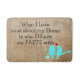 Funny bath mat that says "What I love most about my home is who I share my farts with." wood background with heart and love bird clip art.