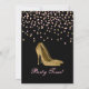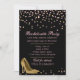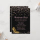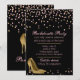 Glam bachelorette party invitation done in black, with graphics of pink and gold tone confetti and golden stiletto high heels. Personalise the pink custom text to suit your needs.