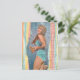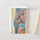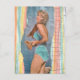 A beautiful woman from a a magazine photo from 1957 poses in her swimsuit on the beach in a collage on a vintage textbook page with random colorful lines on it. Her swimsuit was white but I colored it with tempera paint sticks to be blue