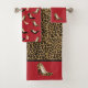 Lady's chic bath towel set done in a fashion high heel and jaguar print. The bath towel is done in a brown and black jaguar cat fur pattern, with black and red accents on one end. The hand towel is done in a high heel pattern set on red. The wash cloth is done in solid red. A pair of jaguar print stilettos carry over on each towel.