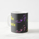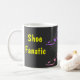 Coffee mug for females who love high heel shoes. Colourful designer polka dot heels with fun shopaholic logo on a bold black background.