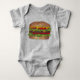 Baby suit features an original marker illustration of a delicious fast food burger topped with lettuce, tomato, and melted cheese.