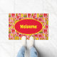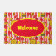 Colourful welcome mat printed with hot dogs, burgers, ketchup pots and mustard bottles on red and white stripes. Perfect for diner doorways, restaurant and bar entrances or festival hot dog carts