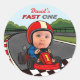 Fast ONE Custom Race CarZoom into birthday fun with this adorable Fast ONE Custom Round Sticker! Featuring your child driving a race car, wearing a helmet, and crossing the chequered finish line, this design includes bold red and chequered “Fast ONE” lettering and two racing flags for extra flair.