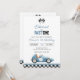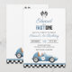 This fun 1st birthday party invitation features a vintage blue race car and chequered flags. Designed by Thisisnotme©