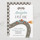 Fast One Race Car 1st Birthday Invitation with blue retro race car.