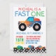 FAST ONE BOYS BIRTHDAY THEME! RED GREEN AND WHITE COLORFUL MONSTER TRUCKS WITH BLACK AND WHITE GROOVY CHECKERED PATTERN RETRO STYLE EDITABLE KIDS BIRTHDAY PARTY
