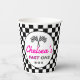 Fuel up the fun with these Fast ONE Custom Girl's Birthday paper cups! designed with a bold chequered black and white border and a centre label for your custom birthday name, in pink. Perfect for juice, punch, or party fuel, these cups are a must-have for every high-energy celebration.