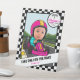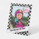 Wrap up the celebration in full-speed style with this Fast ONE Favour Table pedestal sign! Featuring your child’s face driving a race car across the chequered finish line, a bold black and white chequered border, racetrack background, and twin race flags in a custom round label with the “Fast” (in pink) and “ONE” (in chequered) lettering—this sign is the perfect finishing touch for your party favour station.