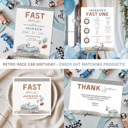 Fast One Racing Car Blue Boy 1st Photo Birthday Invitation