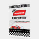 Fun race car theme boy's birthday party welcome sign featuring illustration of a red retro race car. The text says "welcome to xx track".