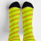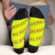 Fun high-performance athletic socks for fastpitch softball players and fans, with a graphic of red softball laces running vertically around the socks on a bright yellow background. These make a fun gift idea for fastpitch softball players and fans!