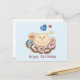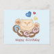 Fat cat sweet tooth Happy Birthday Postcard on blue background