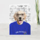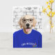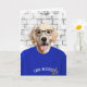 Golden retriever dog in blue t-shirt and black framed eyeglasses on brick wall background for Dad for Father's Day.