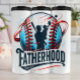 This dynamic baseball-themed graphic celebrates fatherhood, featuring a silhouette of a dad holding a young child, who is wearing a baseball cap and glove ready to catch. The father holds a bat, all enclosed within a classic baseball with vibrant red stitching and blue motion lines. The word "Fatherhood" is boldly scripted below, ideal for sports-loving dads.
