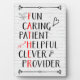 Father's Day sign for dad with descriptive words, including fun, caring, patient, helpful, clever, provider, with certain letters which spell out "FATHER" Card has distressed white brick background and rabbit, heart, arrow and light bulb doodles.