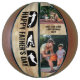 Happy Father's Day Dad Personalised Basketball. The design is lettered with "Happy Father's Day Dad" and the template is ready for you to personalise with your custom text such as, Best Dad Ever, love [kids name and year]. The typography is decorated with basketball player silhouettes and a woodgrain effect background. Great father's day gift for a basketball dad!