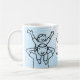 "Dad, Happy Father's Day!" reads the text on this mug featuring a cartoon style drawing of a father carrying his child on his shoulders with a white sunburst over a blue coloured sky in the background. Blue background colour may be customised. Perfect gift for a special dad on Father's Day! Designed by world renowned artist ©Tim Coffey.