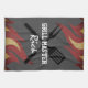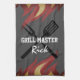 Father's Day gift grillmaster kitchen towel for him. Cool gift idea for chef cook, best dad, greatest father, husband, uncle, grandpa or professional chef. Personalize with your own quote and name. Fire flames design with bbq tools. Also great for Birthday or retirement. Spatula and fork for grilling food on a barbecue fire.
