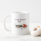 A father’s day mug showing Chapel Smith a cute, redhead girl with two red ponytails wearing a little black dress, an old-fashioned blue and white baseball cap and holding a baseball bat in a batting stance waiting for her dad to pitch her a baseball. Even though her dad’s pitches are terrible, Chapel says “Dad, I love you.” On the inside is Chapel knocked on the ground unconscious by her dad’s pitch with her baseball hat, baseball bat, and the baseball on the ground, her glasses crooked on her face with stars around her head. There is also the saying “Happy Father’s Day.” A perfect gift for any dad or granddad!