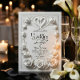 This design features a hyper-realistic optical illusion (trompe l'oeil) that simulates the look of a white bas-relief stone carving, though the surface is smooth and flat printed ink. An ornate, architectural rectangular frame borders the layout, featuring sculpted details of blooming roses and tulips climbing the sides. At the top center, two graceful swans face one another, their curved necks creating a distinct heart shape. The entire background mimics the texture of plaster or ivory stone. Inside this framework, the wedding details are presented in a stark, contrasting black formal serif font and elegant calligraphy script, centered vertically for a traditional and balanced composition.