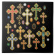 Add a touch of Christian bling to your home decor with a ceramic tile decorated with colourful faux birthstone-encrusted budded gold crosses and loose, unmounted gems on a black background! + NOTE WELL: All elements of this item are flat, 2-dimensional, and PRINTED! No actual gemstones or metals are used in its production. + WYSIWYG + Image Credits: The gemstones have been extracted from two antique postcard series: 1) the Lucky Horseshoe Birthstone series, originally published by Adelbert Kohn, Philadelphia, Pennsylvania, 1907; and 2) the Gem Birthday (“star”) series, originally published by the Art Manufacturing Company, Amelia, Ohio, 1908-1915. Both postcard series are from the designer’s private collection. + The pearls are licensed clipart from Shiny Pearl 2 pack by Lary Cao.