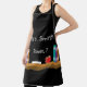 An all over print apron designed for teachers with a faux chalkboard background , a few books , a red apple and a chalk . Personalize it with the teacher's name and room number .