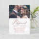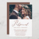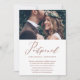 Elegant change the date wedding postponement announcement. This simple announcement is a chic way to let invited guests know that your wedding date has been rescheduled due to unforeseen circumstances, and includes the new wedding date. This trendy announcement features beautiful "postponed" faux copper calligraphy script on a white background with the couple's photo, and a copper brown back of the card.