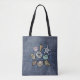 Faux denim fabric bag with seashell artwork on both sides. Dark blue image mimics denim fabric, with drawings of tropical beach shells.