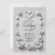 This design showcases a luxurious, monochromatic composition featuring a faux embossed border of sculpted roses and botanical scrollwork in shades of creamy ivory and white. At the header, a romantic silhouette couple is framed by an intertwined heart motif, creating a sense of historical romance. The typography combines sweeping black calligraphy for names with structured serif fonts for ceremony details, set against a clean neutral background to maximize readability. This is a flat printed image with a Faux Embossed effect, not actual raised material.