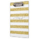 First, I really liked the weight of the clipboard. It's heavy but not too heavy. I like the feel of it as well. Really smooth but like it has a coat of matte polyurethane on it on both side. The clip is sturdy and strong. The design is the best. I'm really into gold right now and this stripped, gold glitter thing is right up my alley! The printing is great! I put my logo on the back really large and small in the front. I'm always misplacing my clipboards at weddings and events and this one should never get lost. Love the colors. Came out so well!