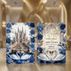 Transport your guests to a realm of majestic romance with this Gothic cathedral design. Featuring royal swans and deep indigo roses for a fairytale union.This design captures the essence of a high-fantasy romance set within the vaulted arches of a grand stone cathedral. The artwork features two majestic white swans meeting on a deep blue water surface to form a subtle heart shape, framed by a tiered stone fountain and a grand staircase. The color palette is dominated by deep navy and indigo floral borders, contrasted against creamy, off-white marble textures and faux bronze foliage. Typography pairs an intricate Gothic Blackletter font for names with an elegant gold-tone calligraphy script for details. This is a flat printed image with a faux gold foil and marble effect, not actual raised metal or stone material.