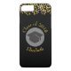 A phone case which says: Class of 20xx and personalised with a name, both written in curved text. Designed with fake gold confetti glitter. Set on a black background. Illustrated with a black graduation cap with a semi-transparent circle behind. Elegant and chic.