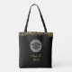 A tote bag which says: Class of 20xx. Designed with fake gold confetti glitter. Set on a black background. Illustrated with a black graduation cap with a semi-transparent circle behind. Elegant and chic.