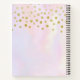 Personalised spiral notebook with fake gold confetti sprinkled along the top. A pale purple and yellow watercolor background.