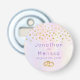 Bottle opener with fake gold confetti sprinkled along the top. 2 golden wedding rings below your personalised text. A pale purple and yellow watercolor background.