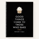 Chic recipe notebook in black and white and faux gold glitter with "good things come to those who bake" written on the cover in a modern font beneath a white cupcake with frosting decorated with little golden hearts. Personalize with your name.