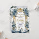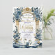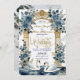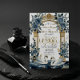 This design features a pair of graceful white swans with outstretched wings, framed by a classical architectural archway and columns. The composition is adorned with a romantic watercolor bouquet of slate blue and dusty blue roses, interspersed with soft gray eucalyptus foliage. The background simulates a refined marble texture in soft ivory, accented by a printed yellow-gold geometric frame. The typography combines a flowing handwritten script with traditional serif fonts for a timeless aesthetic.This is a flat printed image with a Faux Gold Foil and Marble effect, not actual raised metal or stone material.