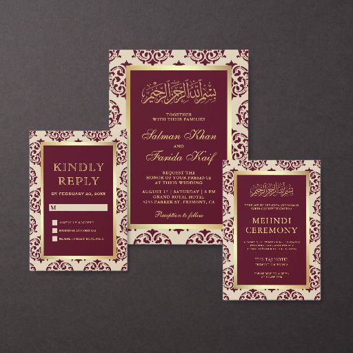 Amaze your guests with this elegant wedding invitation featuring a faux gold border and 'Bismillah' in Arabic calligraphy against a burgundy and beige damask background. Simply add your event details on this easy-to-use template to make it a one-of-a-kind invitation.